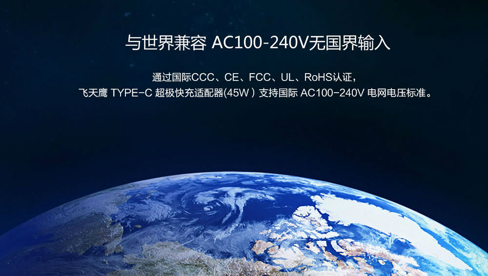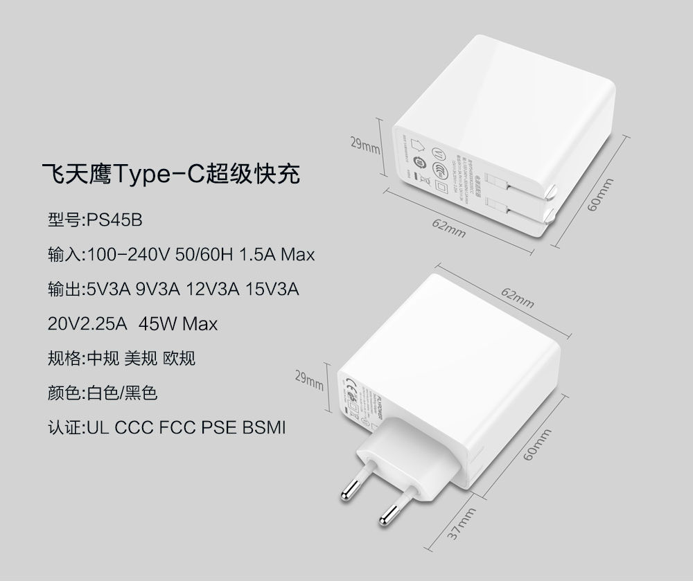 type-c充電器功能特點:5V3A 15V3A 12V3A 9V3A 20V2.5A 超極快充 PD2.0快充協(xié)議·45W大功率·五種充電電壓·