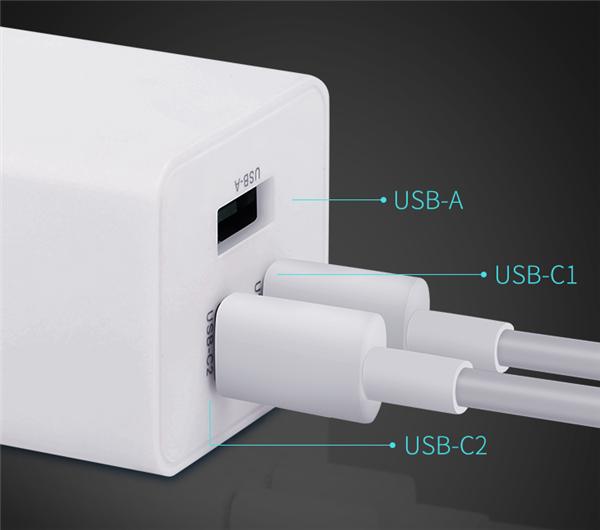 充電器配備兩個USB-C和一個USB-A輸出接口,單獨使用均支持快充,其中USB-C1最大功率65W,兼容5V/3A、9V/3A、12V/3A、15V/3A、20V/3.25A;USB-C2最大功率30W,兼容11V/3A、16V/2A、5V/3A、9V/3A、12V/2.5A、15V/2A、20V/1.5A,USB-A最大功率24W,兼容4.5V/5A、5V/4.5A、9V/2A、12V/2A。即便同時使用兩個接口也可實現快充,比如USB-C1+USB-C2、USB-C1+USB-A都可以最高輸出63W,分別為45W+18W,USB-C2+USB-A最高可輸出60W,分別為45W+15W。